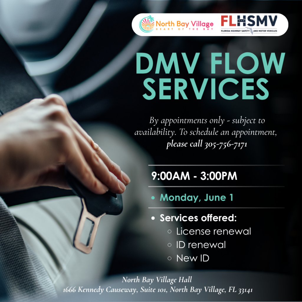 Florida DMV Licensing On Wheels (FLOW) Services Schedule for NBV: Appointments will be offered at Village Hall from 9:00 AM to 3:00 PM on the following dates: Monday, June 1 By appointment only- to schedule an appointment, please call: 305-756-7171 Note: Written/ Skills examinations are not conducted through the FLOW program.