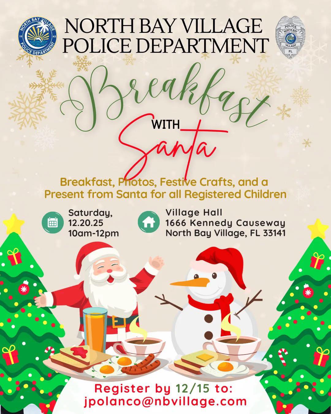 The North Bay Village Police Department is excited to welcome our North Bay Village families to a festive morning filled with breakfast, photos with Santa, holiday crafts, and a special present for all registered children! 🎁❤️