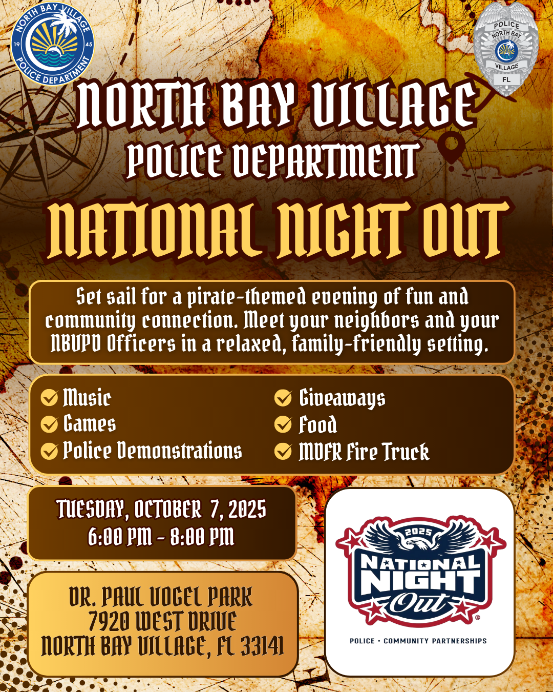 Meet your North Bay Village Police Officers, enjoy music, games, and food, and learn more about public safety in a relaxed, family-friendly setting.