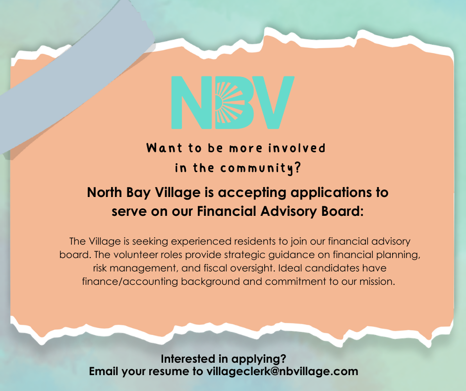 North Bay Village is seeking a qualified candidate to join our Financial Advisory Board. This volunteer role offers the opportunity to serve your community while contributing valuable expertise.