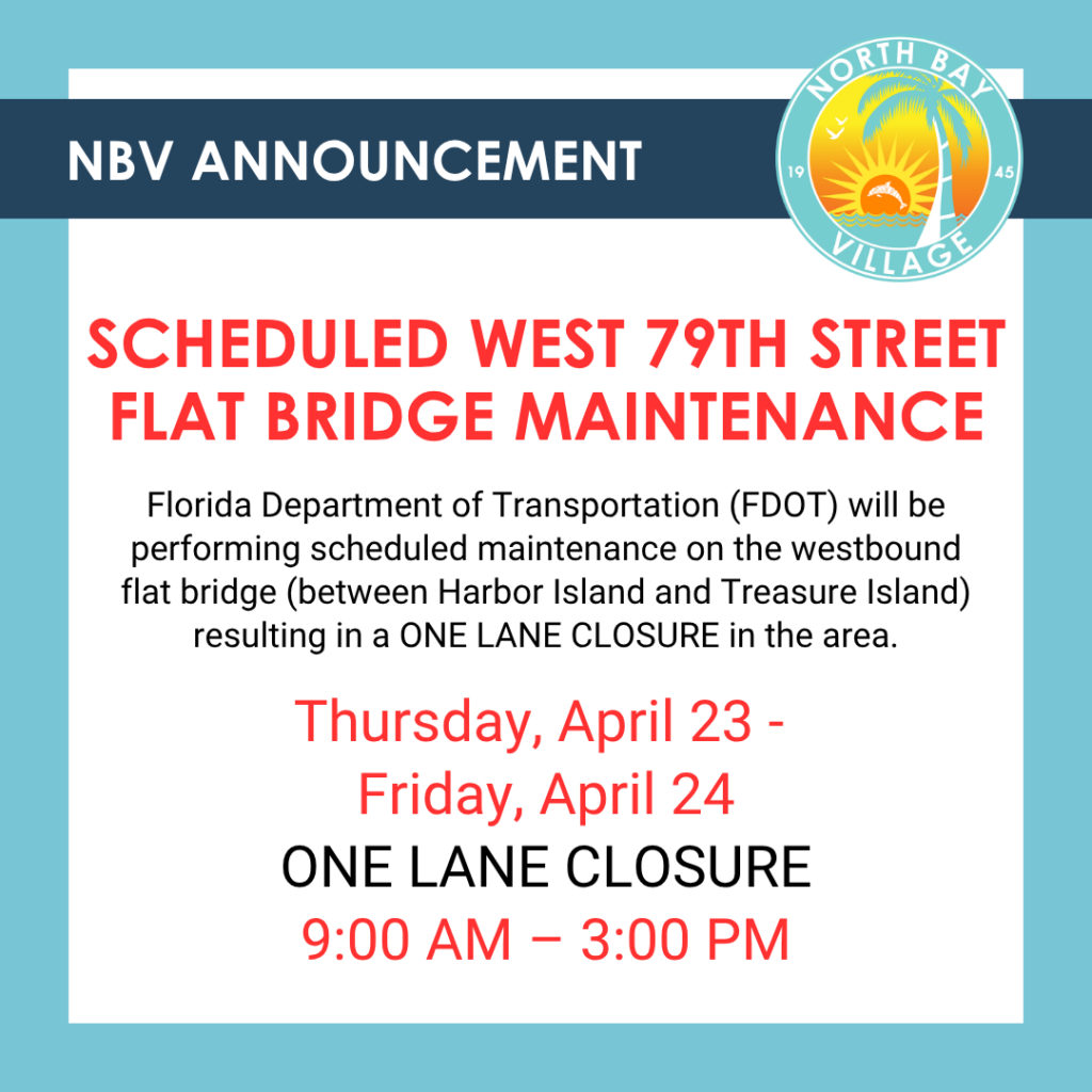 Florida Department of Transportation (FDOT) will be performing scheduled maintenance on the westbound flat bridge (between Harbor Island and Treasure Island) resulting in a ONE LANE CLOSURE in the area.