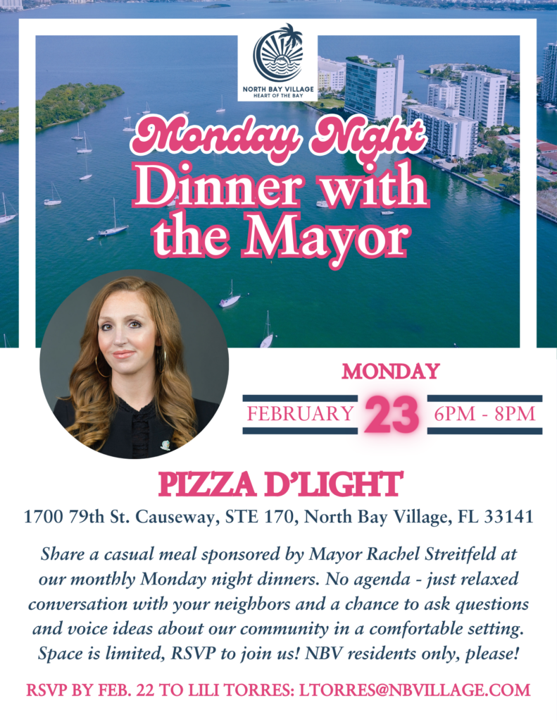 Join Mayor Rachel Streitfeld for an intimate dinner gathering where residents can share ideas and discuss their vision for North Bay Village in a relaxed setting.